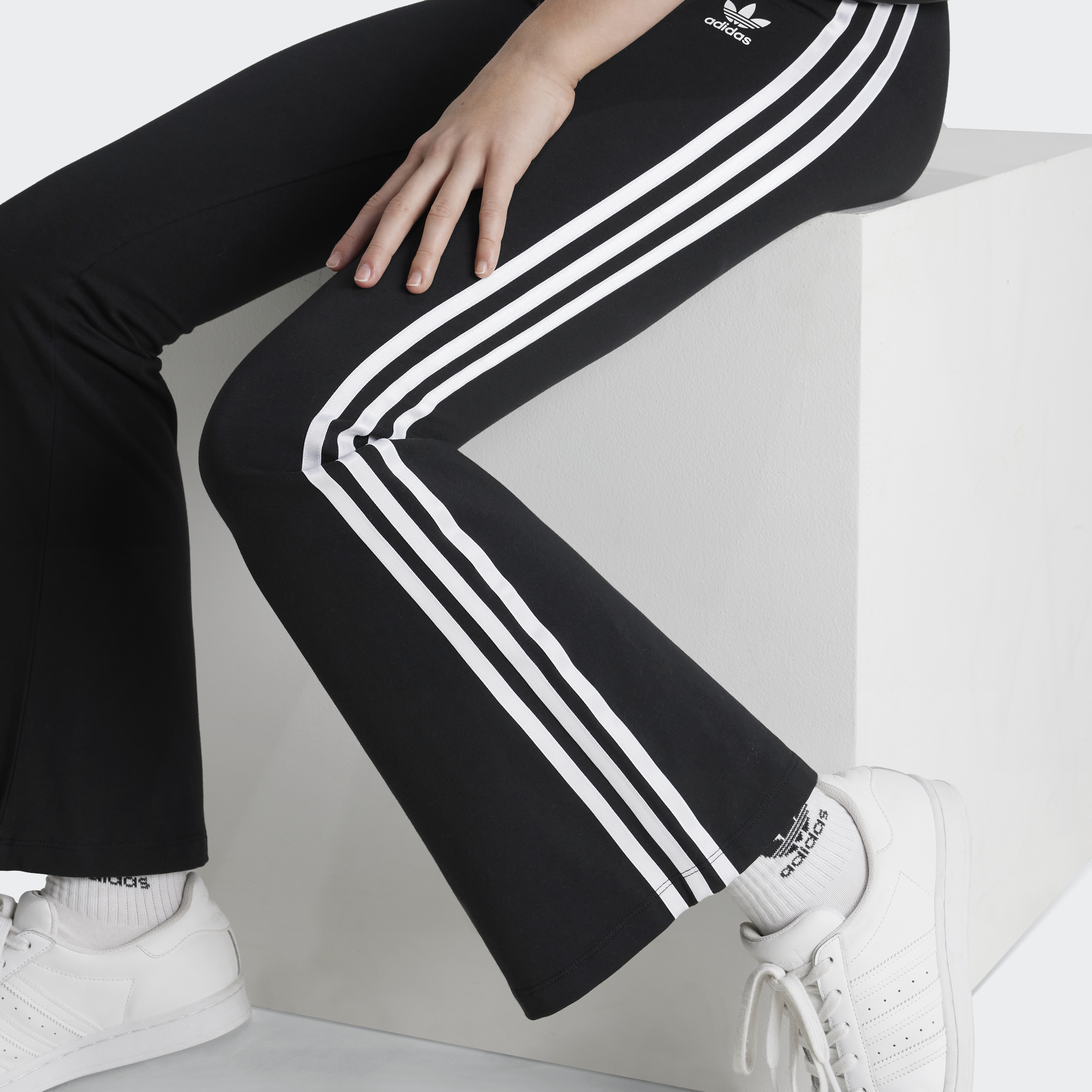 Keep it casual yet cool in this pair of juniors' leggings. Made of single jersey knit, the soft and stretchy fabric hugs your curves and ends at a flared leg, resulting in a flattering and comfortable fit. Contrast-colour 3-Stripes run down both legs, combining with a Trefoil logo to make their sport heritage abundantly clear.